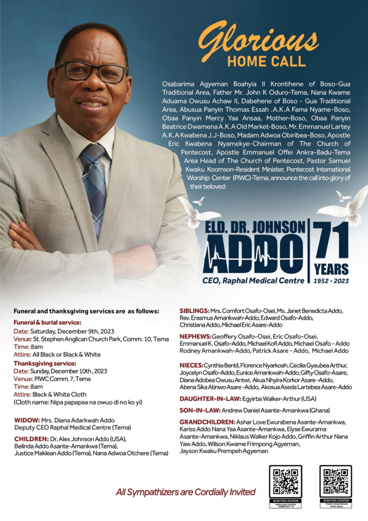 Osabarima Agyeman Boahyia II Krontihene of Boso-Gua Traditional Area, Father Mr. John K Oduro-Tema, Nana Kwame Aduama Owusu Achaw II, Dabehene of Boso – Gua Traditional Area, Abusua Panyin Thomas Essah .A.K.A Fama Nyame-Boso, Obaa Panyin Mercy Yaa Ansaa, Mother-Boso, Obaa Panyin Beatrice Dwamena A.K.A Old Market-Boso, Mr. Emmanuel Lartey A.K.A Kwabena J. J-Boso, Madam Adwoa Obiribea-Boso, Apostle Eric Kwabena Nyamekye-Chairman of The Church of Pentecost, Apostle Emmanuel Offei Ankra-Badu-Tema Area Head of The Church of Pentecost, Pastor Samuel Kwaku Koomson-Resident Minister, Pentecost International Worship Center (PIWC)-Tema, announce the call into glory of their beloved: