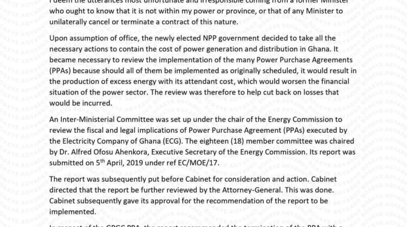 “An Inter-Ministerial Committee was set up under the chair of the Energy Commission to review the fiscal and legal implications of Power Purchase Agreements (PPAs) executed by the Electricity Company of Ghana (ECG). The eighteen (18) member committee was chaired by Dr. Alfred Ofosu Ahenkora, Executive Secretary of the Energy Commission. Its report was submitted on 5th April, 2019 under ref EC/MOE/17.